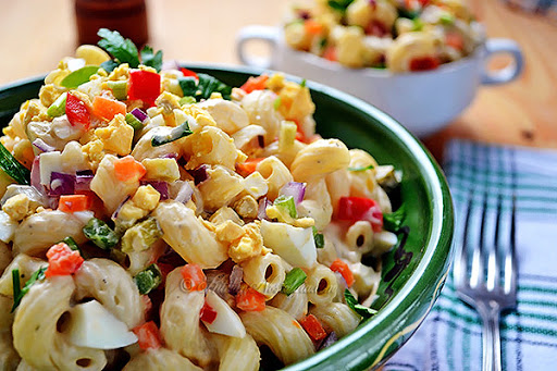 In a large bowl, stir together macaroni, onion, celery, eggs, red pepper, carrot and relish.