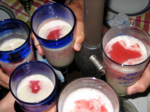 Blend the 2 rums and the strawberries in a blender to form a smooth paste. Pour this mixture into a tall (Collins or Hurricane) glass. Rinse the blender. Blend the banana, the coconut cream, and the pineapple juice in blender with ice until smooth. Pour this mixture into the glass with the rums very slowly and watch as the strawberry mixture oozes its way to the top along the sides of the glass creating the flowing lava effect. Garnish with a pineapple wedge and paper umbrella.
