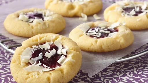 Shape dough into 1-inch balls. On ungreased cookie sheets, place balls 2 inches apart. Using thumb or handle of wooden spoon, make indentation in center of each ball. Spoon about 1/4 teaspoon jam into each indentation.