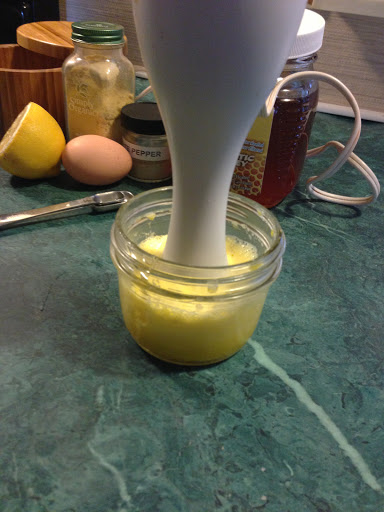 I crack my egg into a wide mouth canning jar and use my stick blender to mix it up really well. Add in the lemon juice, honey, mustard and salt, and blend well. With your stick blender in one hand, begin to slowly drizzle in your oil. It will emulsify (thicken), keep adding oil until it’s to your desired thickness. Enjoy!