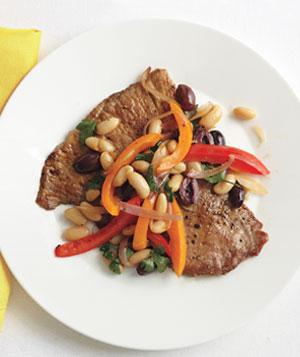 Add the beans, olives, parsley, and vinegar to the skillet and toss to combine. Serve the pork topped with the vegetable mixture.