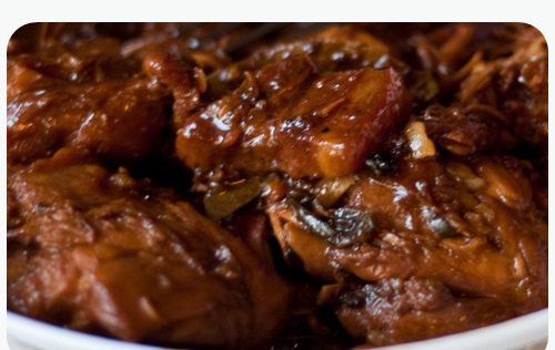 Marinade the following ingredients for about 1 hour: pork, soy sauce and minced or crushed garlic.