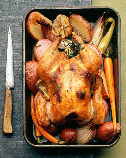 Roast chicken and vegetables, basting 2 or 3 times with pan juices, until an instant-read thermometer inserted into thickest part of chicken thigh registers 165 degrees and juices run clear, 1 to 1 1/2 hours.