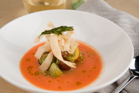 Marc Forgione's Tomato Soup with Basil Marinated Cherry Tomatoes and Spicy Spring Roll Crouton 1 Picture