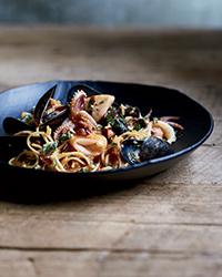 Stir in the mussels and calamari, cover and cook over low heat until the mussels open,