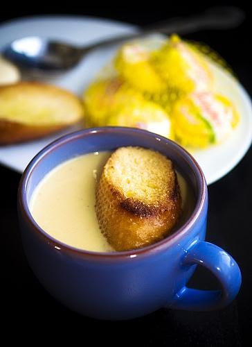 - Pour the soup into a bowl and put in a toasted piece of bread on top. Serve immediately.