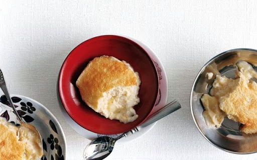 Pour into baking dish and bake in a hot water bath until puffed and golden, 40 to 45 minutes. Transfer to a rack.