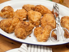 Take the chicken out of the fridge, remove it from the buttermilk and drain on a rack set over a baking sheet to catch any excess brine. Set aside. Whisk the flour together with the panko, salt and pepper. One by one, dredge the chicken pieces in the flour mixture, tapping off excess breading. Set the breaded chicken back on the rack and set aside.
