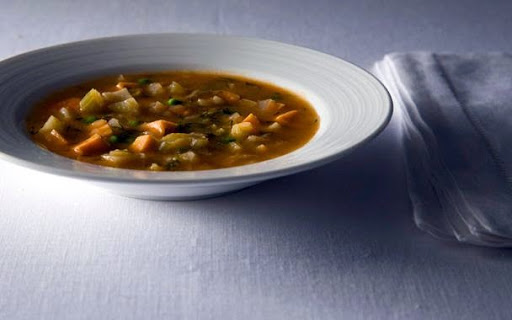 Cook onion with bay leaf and 1/2 tsp salt in oil in a 4- to 5-quart heavy pot over medium-high heat, stirring occasionally, until softened, about 5 minutes. Add carrot and celery and cook, stirring, until softened, about 3 minutes.