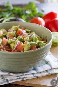 In a large bowl, combine the tomatoes, avocados, red onions and cilantro. Squeeze the lime juice over the top and drizzle with extra virgin olive oil. Gently stir. Taste and add salt as needed.