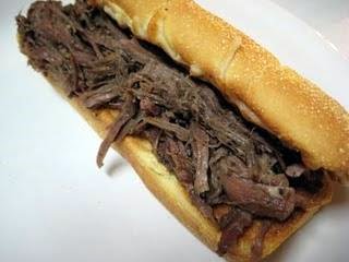 When done, remove bay leaf, and shred meat with a fork (I did this step about 45 minutes before eating so the shredded meat had time to absorb more of the juices in the crock pot). Serve on crusty rolls with cheese, if desired.