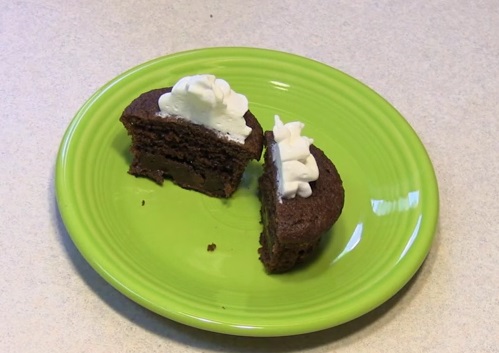 Mix together on slow for about 30 seconds then 2 minutes on medium speed. Fill your cupcake liners one-third full, then one scoop (about 1 tsp) of the truffle mix, then cover again with another third of cupcake mix.