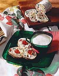 2. Combine candied fruit and walnuts in medium bowl. Stir 1/4 cup flour into fruit mixture. Add remaining 2-1/4 cups flour to butter mixture; beat at low speed until blended. Stir in fruit mixture with spoon.