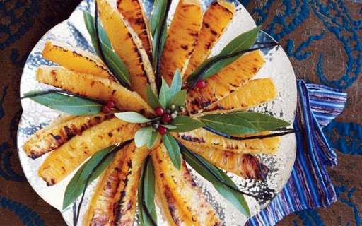 COOKS NOTE: Pineapple can be poached and liquid reduced 1 day ahead and chilled separately.