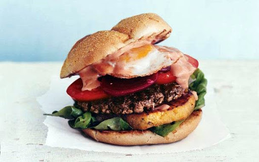 Spread chile mayonnaise on rolls, then assemble burgers with pineapple, beets, eggs, lettuce, and tomato.