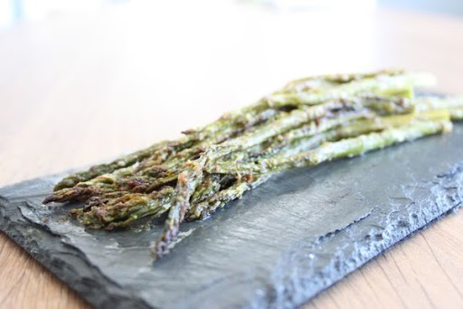 Mix together mayo and mustard. Use your hands to lather it all over the asparagus. In a pan on a middle rack, broil on high for about 15 minutes, turning regularly so all sides cook and asparagus is tender and blistered. Finish with lemon and black pepper if desired. Serve warm or at room temperature.