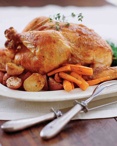 Spread the softened butter over entire surface of chicken, and sprinkle liberally with salt and pepper. Place in the oven, and roast until skin is deep golden brown and crisp and the juices run clear when pierced, about 1 1/2 hours. When chicken seems done, insert an instant-read thermometer into the breast, then the thigh. The breast temperature should read 180 degrees and the thigh 190 degrees.