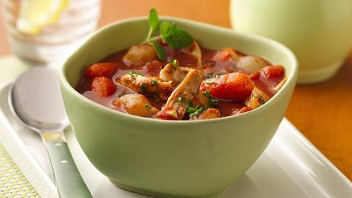 * Heat the oil in a Dutch oven over medium-high heat. Add the onion and bell pepper and cook, stirring frequently, until they begin to soften, about 4 minutes. Add the garlic and seasoning and cook for 1 minute, stirring constantly. Add the tomatoes, garbanzo beans, broth, bay leaves, and pepper. Stir well. Bring to a boil and boil for 5 minutes, stirring frequently. Add the chicken, lower the heat to medium, and simmer, uncovered, for 15 minutes. Stir frequently to prevent sticking. The mixture will thicken. Remove the bay leaves and discard. Stir in the olives and lemon juice, and serve immediately over rice or couscous.