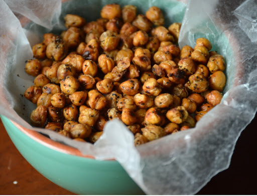I know I’ve been neglecting my blog lately, and it pains me. I’m in my last clinical rotation for my Dietetic Internship (DI) (click here for my first recipe from my DI- Apple S’mores!) and my schedule is a bit hectic. My current rotation is at Hospital for Special Surgery. I work 8-4, and I absolutely love being done with work at 4pm (but I don’t love the 6am alarm clock)! I have time to run while it’s still light out, and I can cook every night. However, working in the clinical setting requires constant learning about different diseases, diets, and medical writing. I love learning new things, but when I get home I just don’t have much energy to write for myself. So, I’m trying to schedule time for blog writing into my hectic schedule. It worked last week because I have a recipe for you! I made Crunchy Chickpeas Two Ways, and I was so thrilled by the ease, deliciousness, and healthfulness of this recipe.  As the name suggests, I roasted the chickpeas two ways, one with salt and pepper and one with a dried spice BBQ seasoning that I use for smoky tofu. A great snack for meat eaters and vegans alike, these Crunchy Chickpeas can be eaten alone or thrown atop a salad. Read the Nutrition Notes below to get the skinny on this low-calorie treat.
