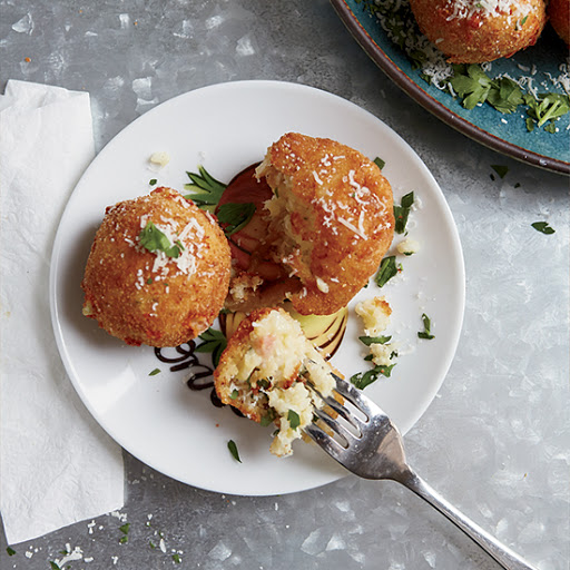 oil and fry over moderate heat, turning occasionally, until golden and heated through, about 4 minutes. Using a slotted spoon, transfer to paper towels to drain. Repeat with the remaining arancini. Pile the arancini on plates or a platter, garnish with chopped mint, grated cheese and coarse sea salt and serve.