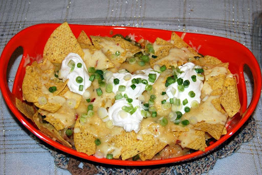 Remove from the oven, and serve garnished with chopped green onion tops, salsa, and sour cream.
