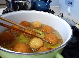 Use two spoons to scoop the dough. With one spoon scoop the batter against the edge of the bowl, scraping off any excess dough. Now scrape the batter onto the other spoon, making sure there isn't any batter dripping off the bottom of the spoon. This makes it nice and round. That way, there won't be a 'tail' on the andagi. Drop the batter into the oil, keeping it close to the oil. I found that using spoons was much easier than dropping them in with your hands. And it's a lot less messy too.