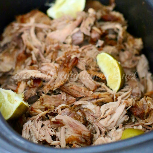 The next morning, unwrap the roast and put it into to crock pot (fat side up) on high for 6 hours or low for 10 hours. No additional liquids are needed for cooking. The pork will cook in its' own juices.