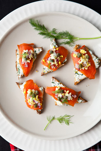 This elegant hors d’oeuvre is full of classic flavors and makes a gorgeous appetizer for festive entertaining. Be sure to use good-quality smoked salmon, and you can prepare the herbed cream cheese and garnishes a day early to get a head start. Assemble the toast points and present them on a platter, or set out all the ingredients and let guests make their own.