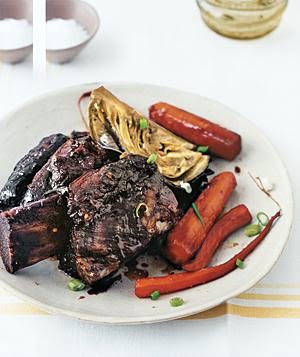 Transfer the cabbage, short ribs, and carrots to plates. With a large spoon or ladle, skim the fat from the cooking liquid and discard.