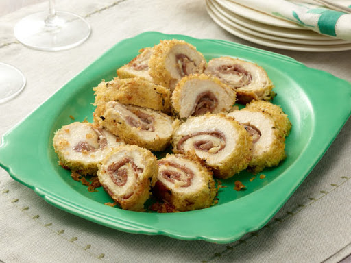 Remove the plastic wrap. Lightly dust the chicken with flour, dip in the egg mixture and gently coat in the bread crumbs. Lightly coat a baking pan with olive oil and carefully transfer the roulades onto it. Bake for 20 to 25 minutes until browned and cooked through.