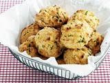 Make the biscuits: Pulse the flour, baking powder, sugar and salt in a food processor. Add the shortening and pulse until combined. Add the butter; pulse 4 or 5 times, or until the butter is in pea-size pieces. Add the cheese and pulse 2 or 3 times. Pour in the milk and pulse just until the mixture is moistened and forms a shaggy dough. Turn out onto a clean surface and gently knead until the dough comes together. Do not overwork the dough or the biscuits will be tough.