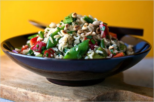 Advance preparation: You can prepare the salad mixture up to a day ahead and keep it in the refrigerator. Don’t toss with the dressing until shortly before serving. As long as you leave the snap peas out, you also can toss the mixture with the dressing up to a day ahead; add the snap peas shortly before serving. The rice will be even more flavorful after it marinates in the dressing.