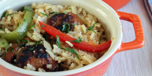 In a large saucepan over medium heat, add the olive oil and sausage. Brown the sausage pieces on both sides, about 5 minutes. Add the onion and garlic, and cook until the onions are soft, about 5 minutes. Add the rice and stir. Add the broth and bring to a boil. Turn the heat to low and cook covered for 10 minutes. Uncover and stir in the bell pepper slices. Cover again and cook until the liquid is absorbed and the rice is done, 10 to 12 minutes. Uncover and season with salt and pepper. If the rice seems wet, cook uncovered for a few minutes.