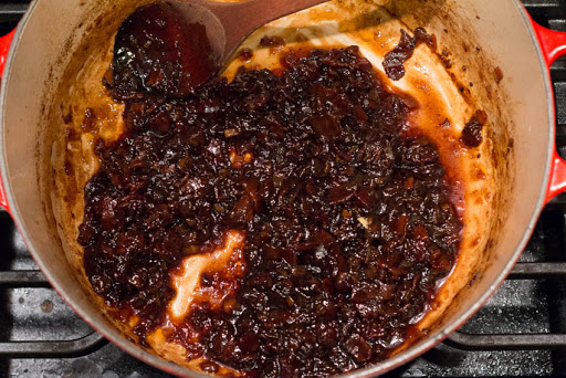 Once the onions start turning translucent, add in the brown sugar, balsamic vinegar, honey, coffee, water and paprika. Bring to a boil and stir until everything is combined.