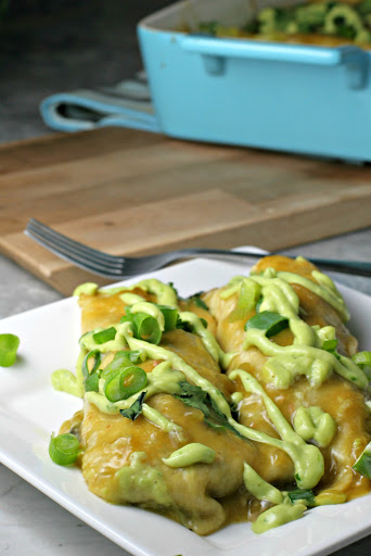 Place a scoop of sautéed kale/sweet potato/black bean mixture into the center of a corn tortilla. Roll up and transfer to cooking dish. Repeat until all 8 enchiladas are stuffed.