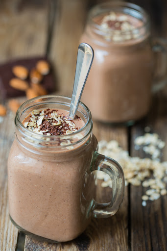 Pour the blended oat mix into your cup, stir in the almond/chocolate mix and serve.