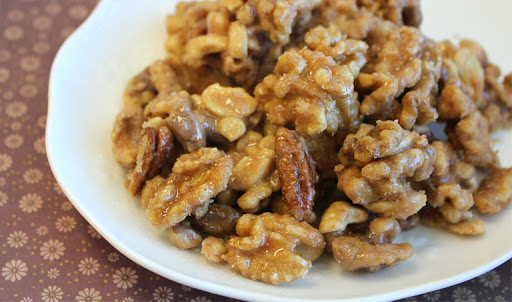 Remove pot from heat, add vanilla extract, stir and pour over the bowl of mixed nuts. Using a wooden or silicone spatula, coat the nuts and lay on a flat surface covered with parchment or wax paper to cool. Once cooled, break apart and enjoy! Use as a topping on a salad, add to a fruit and cheese plate or simply eat by the handful.