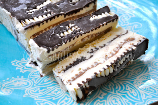 Repeat process using butterscotch magic shell as topping on second layer and then repeat once more, ending with just a drizzling of chocolate magic shell on top.