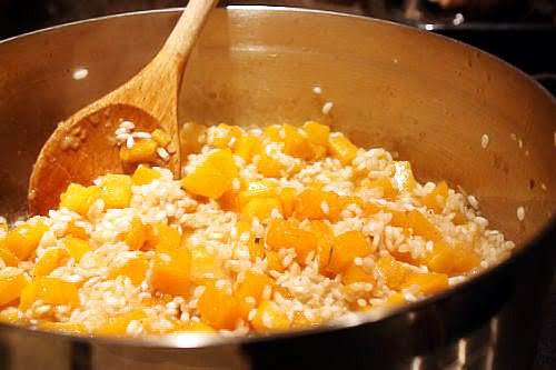 Add rice and stir to coat and then add first cup of broth mixture, stirring until most of the liquid is absorbed. The broth must be hot when adding to the rice. As broth dissolves add more until rice done, about 30 minutes.Rice will be plump and slightly firm to the bite.