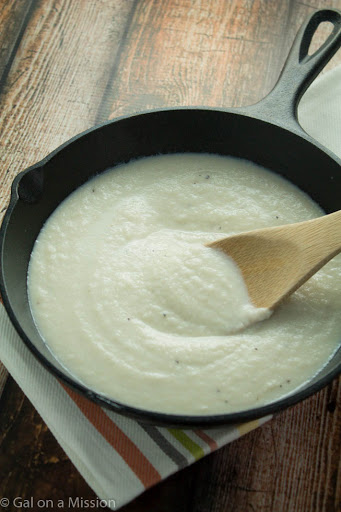 Add the cauliflower, garlic, milk to a blender and pulse until combined and not chunky.