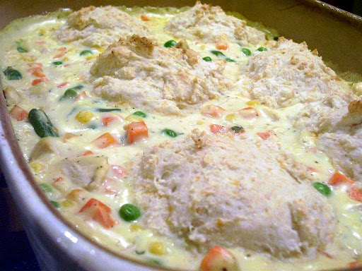 In a small bowl combine baking mix and cheese. Add milk, stirring just until dry ingredients are moistened. Drop batter by heaping tablespoons evenly over chicken mixture. Bake 35-40 min. or until biscuits are browned and pot pie is hot and bubbly.