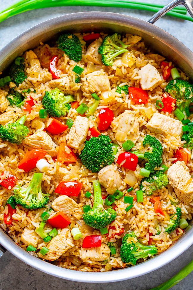 Chicken, Rice, and Vegetable Skillet – EASY, ready in 20 minutes, made in ONE skillet with everyday ingredients you probably have on hand!! A HEALTHY weeknight dinner the whole family will LOVE!!