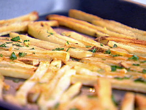 Cut the potatoes into 1/4-inch sticks. In a large bowl, toss the oil, potatoes and 1/2 teaspoon of salt. Spray a baking sheet with cooking spray and spread the potatoes onto it in a single layer. Bake until golden and crisp, about 35 minutes.