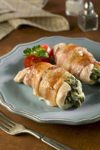 Lay the chicken breasts out on a clean surface, and spoon some of the spinach mixture onto each one. Roll up chicken to enclose the spinach, then wrap each chicken breast with two slices of bacon. Secure with toothpicks, and arrange in a shallow baking dish.