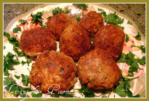 Heat the oil and then lower in the rice balls. Remove when golden and crisp. Drain quickly on paper towels and serve as soon as possible.