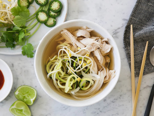 3. Divide the spiralized zucchini and shredded chicken between two bowls. Ladle over the hot liquid, and serve with fresh herbs, chili, lime wedges, and sprouts on the side.