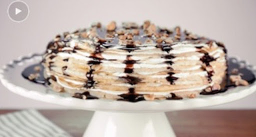 To Assemble: Spread a couple tablespoons of double cream filling onto a crepe. Top with another crepe. Continue with alternating layers of filling and crepes, finishing with a layer of crepe. Drizzle the chocolate glaze over the crepe cake. Garnish with toasted, chopped hazelnuts.