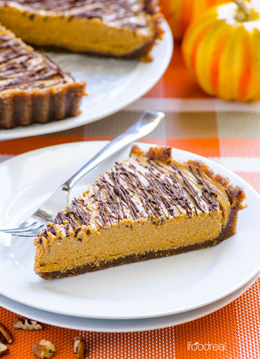 To make the crust, add Crust Ingredients to a food processor and process until mixture is well combined and dough starts to form, stopping and scraping the sides of the bowl. Pause and check if the ingredients are coarsely processed and the dough is wet, the crust is ready. Be careful not to over process the crust into a nut butter. Transfer the dough to a 9" pie dish, a spring form or a non-stick tart pan (I used this one and loved the edge pattern and how easy it was to cut the pie outside the pie plate) and flatten evenly on the bottom and sides with spatula and your hands. Set aside.
