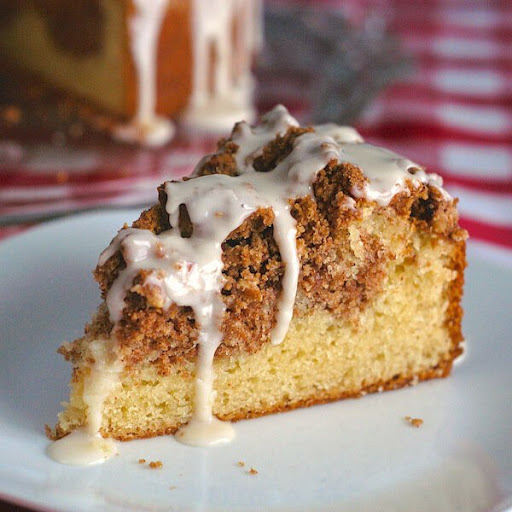 an old fashioned recipe for a cinnamon swirl coffee cake topped with a pecan crumble topping and drizzled in a sweet vanilla glaze.