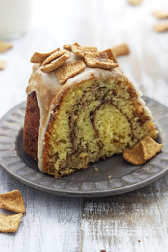 After cake has completely cooled, prepare the icing. Mix together cream cheese, vanilla, and powdered sugar. Add milk 1 tablespoon at a time until a pourable consistency is reached. Drizzle over cake, then top with cinnamon toast crunch cereal if desired. Store in airtight container at room temperature until ready to serve.